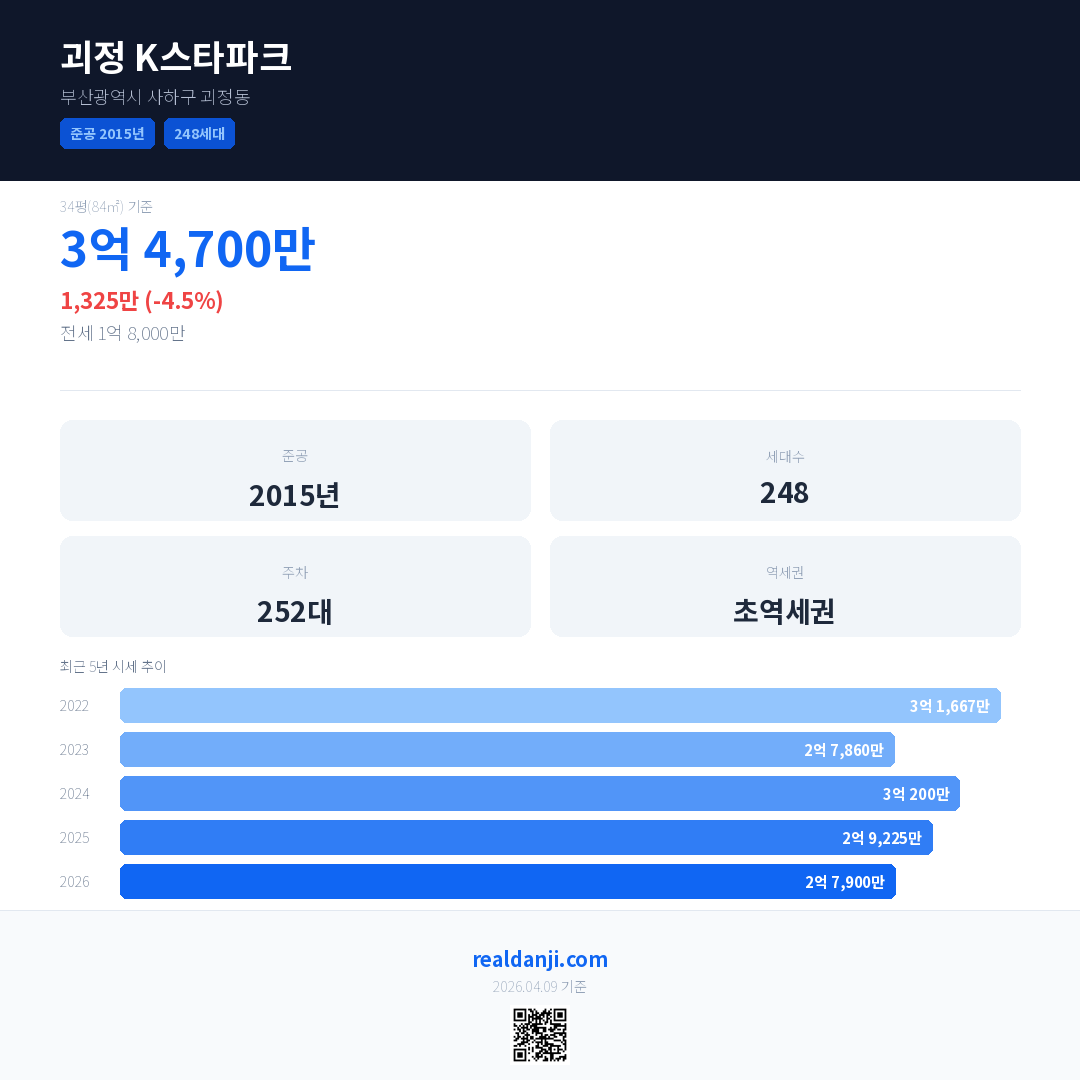 괴정 K스타파크 최근 거래가는 2억 5,000만입니다. (2026-04)