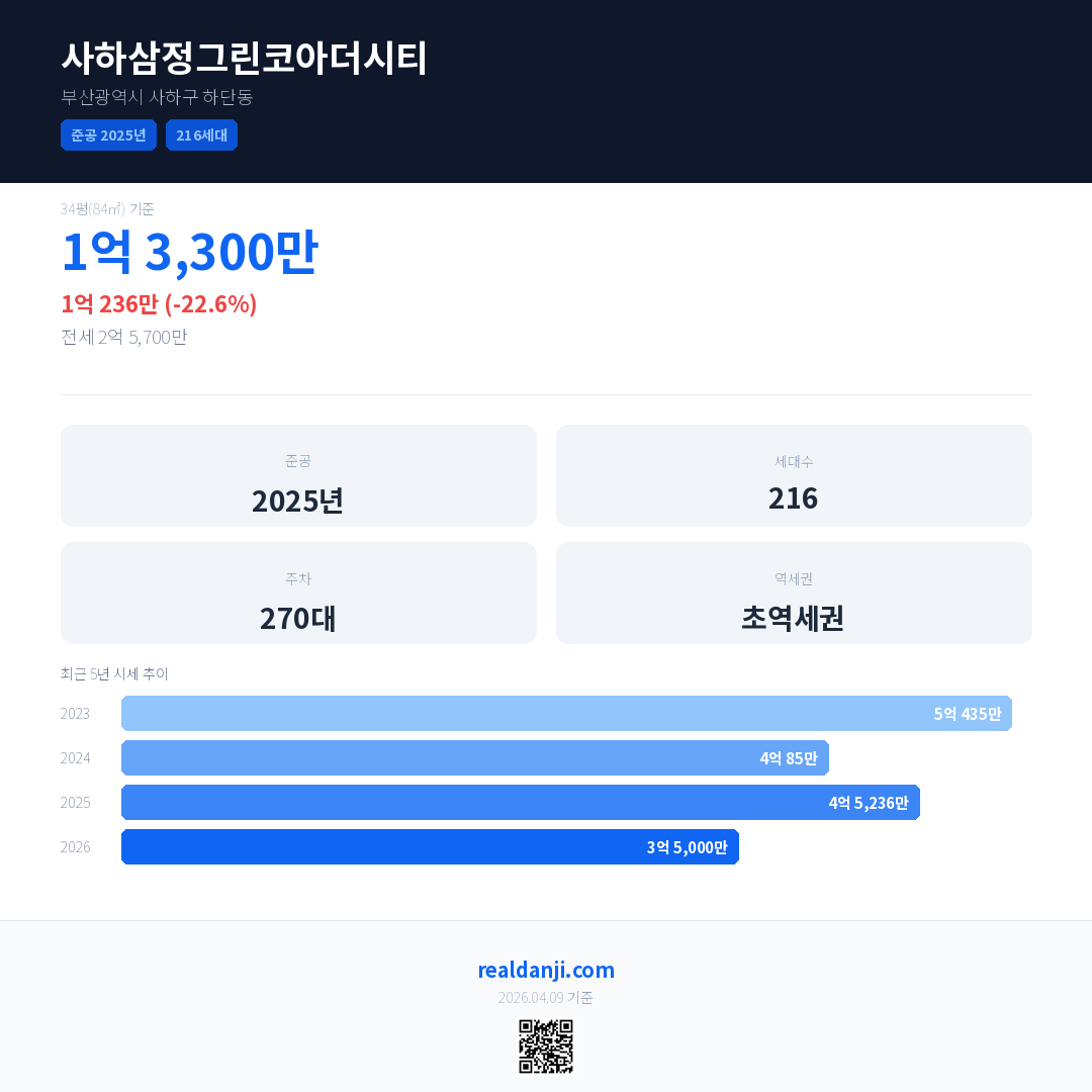 사하삼정그린코아더시티 최근 거래가는 1억 3,300만입니다. (2026-02)