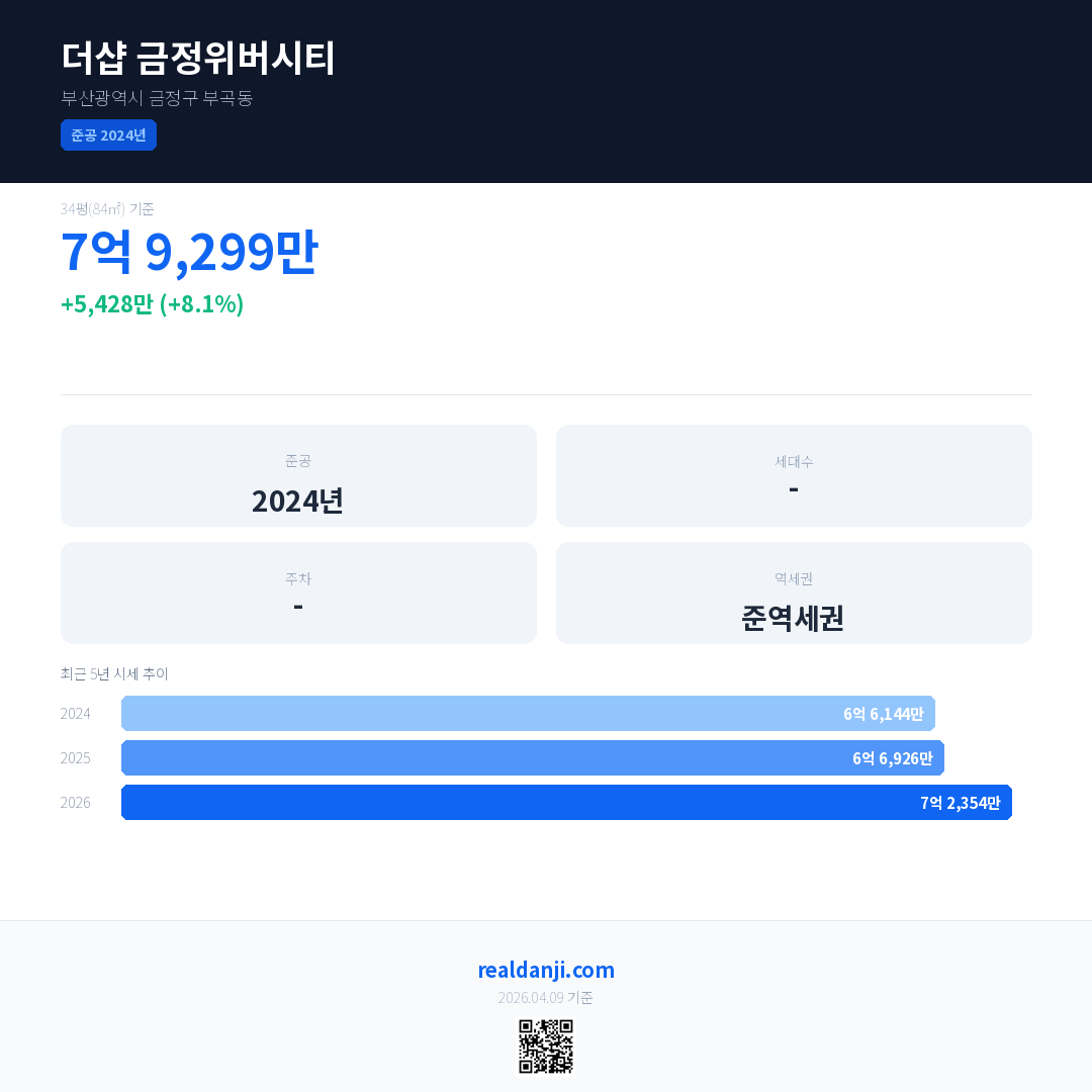 더샵 금정위버시티 국민평형 기준 2026년 평균 거래가는 7억 2,354만으로, 전년 대비 8.1% 상승 했습니다.