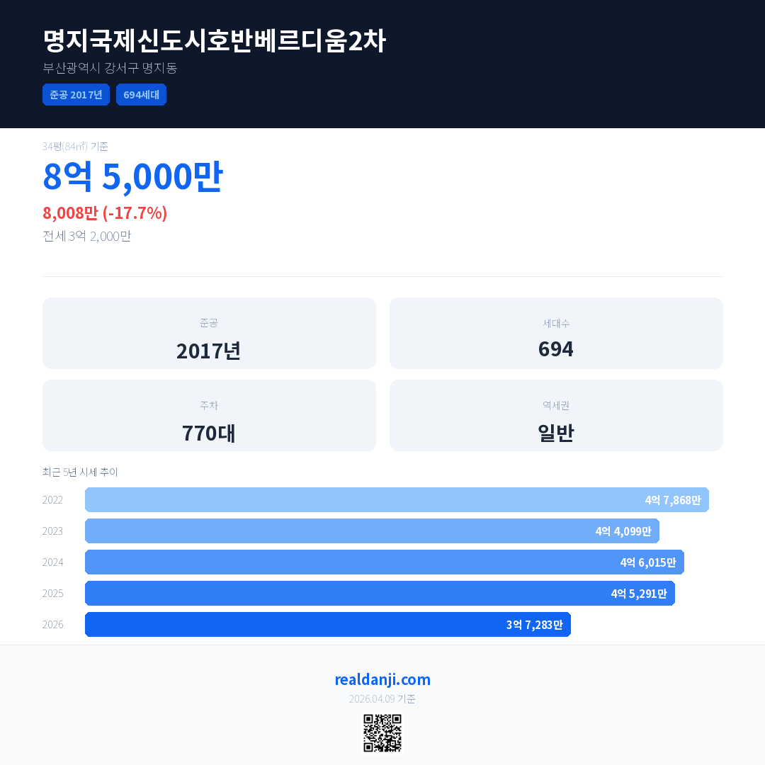 명지국제신도시호반베르디움2차 최근 거래가는 3억 7,700만입니다. (2026-04)