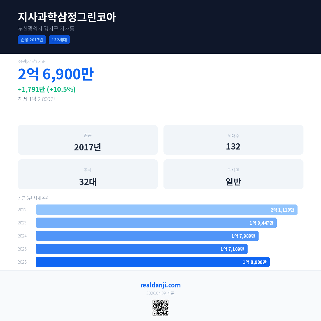 지사과학삼정그린코아 국민평형 기준 2026년 평균 거래가는 1억 8,900만으로, 전년 대비 10.5% 상승 했습니다.