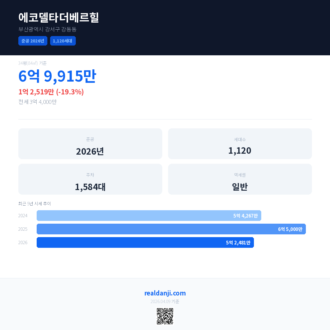 에코델타더베르힐은(는) 2026년에 준공되었으며, 현재 0년차입니다. 총 1,120세대 규모입니다.
