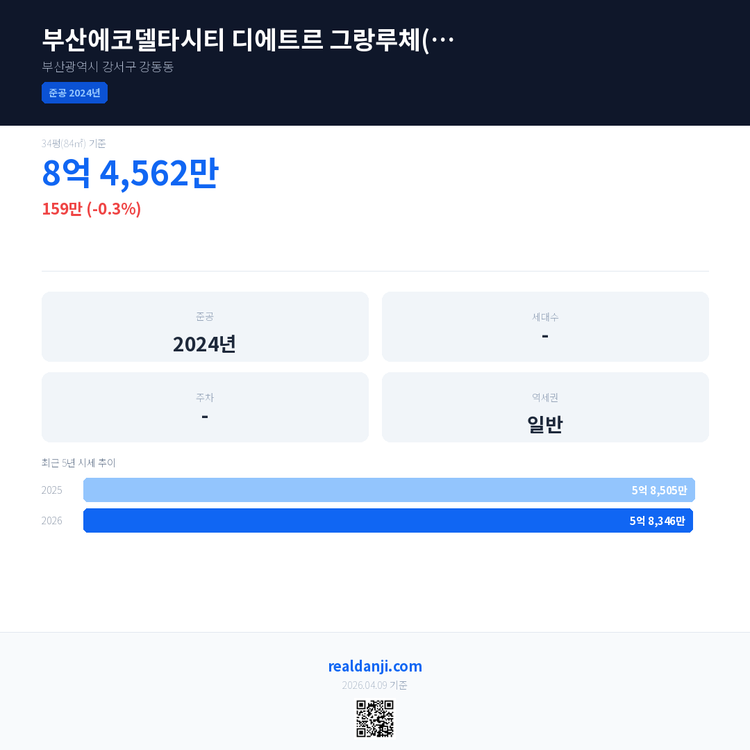 부산에코델타시티 디에트르 그랑루체(13BL) 국민평형 기준 2026년 평균 거래가는 5억 8,346만으로, 전년 대비 0.3% 하락 했습니다.