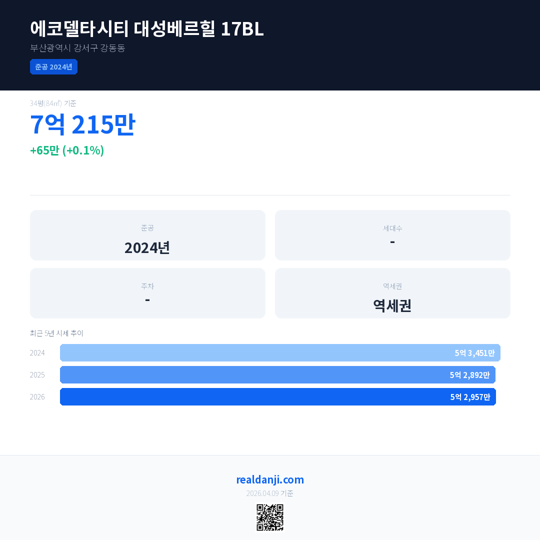 에코델타시티 대성베르힐 17BL 국민평형 기준 2026년 평균 거래가는 5억 2,957만으로, 전년 대비 0.1% 상승 했습니다.