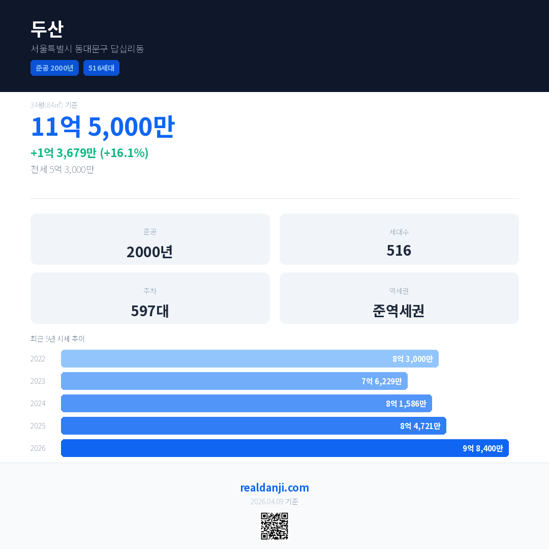 두산 국민평형 기준 2026년 평균 거래가는 9억 8,400만으로, 전년 대비 16.1% 상승 했습니다.