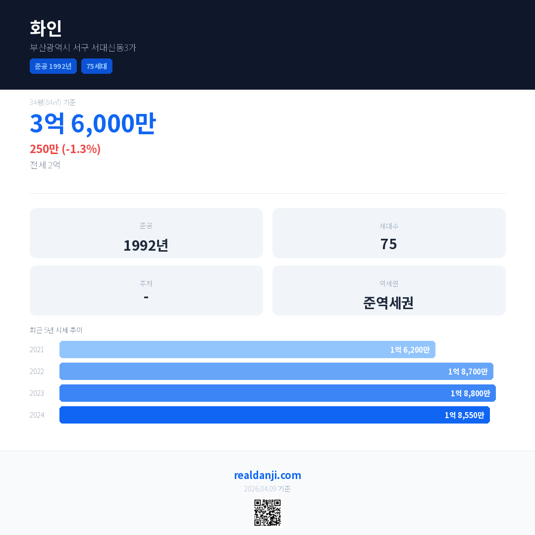 화인 국민평형 기준 2024년 평균 거래가는 1억 8,550만으로, 전년 대비 1.3% 하락 했습니다.