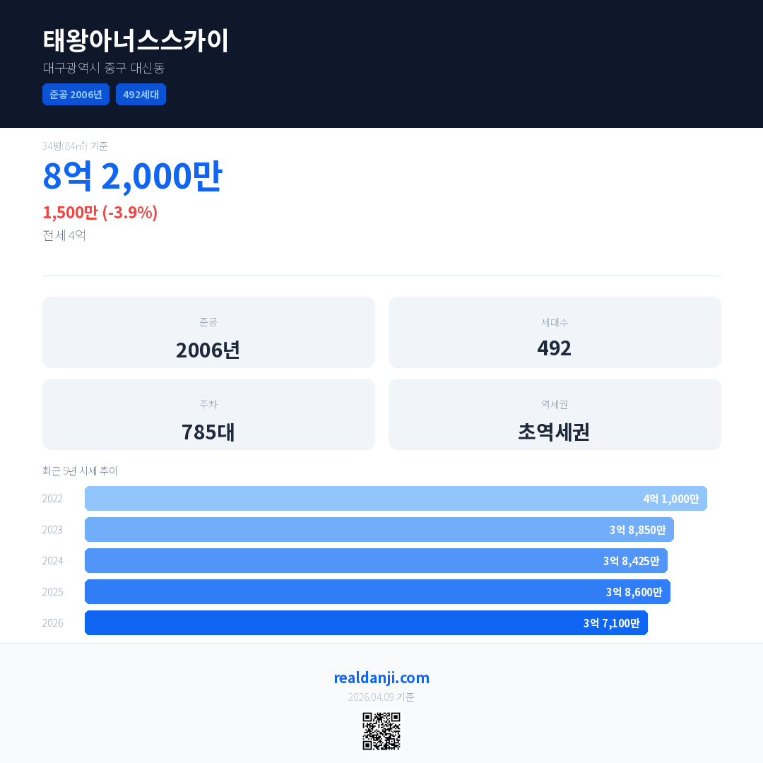 태왕아너스스카이 국민평형 기준 2026년 평균 거래가는 3억 7,100만으로, 전년 대비 3.9% 하락 했습니다.