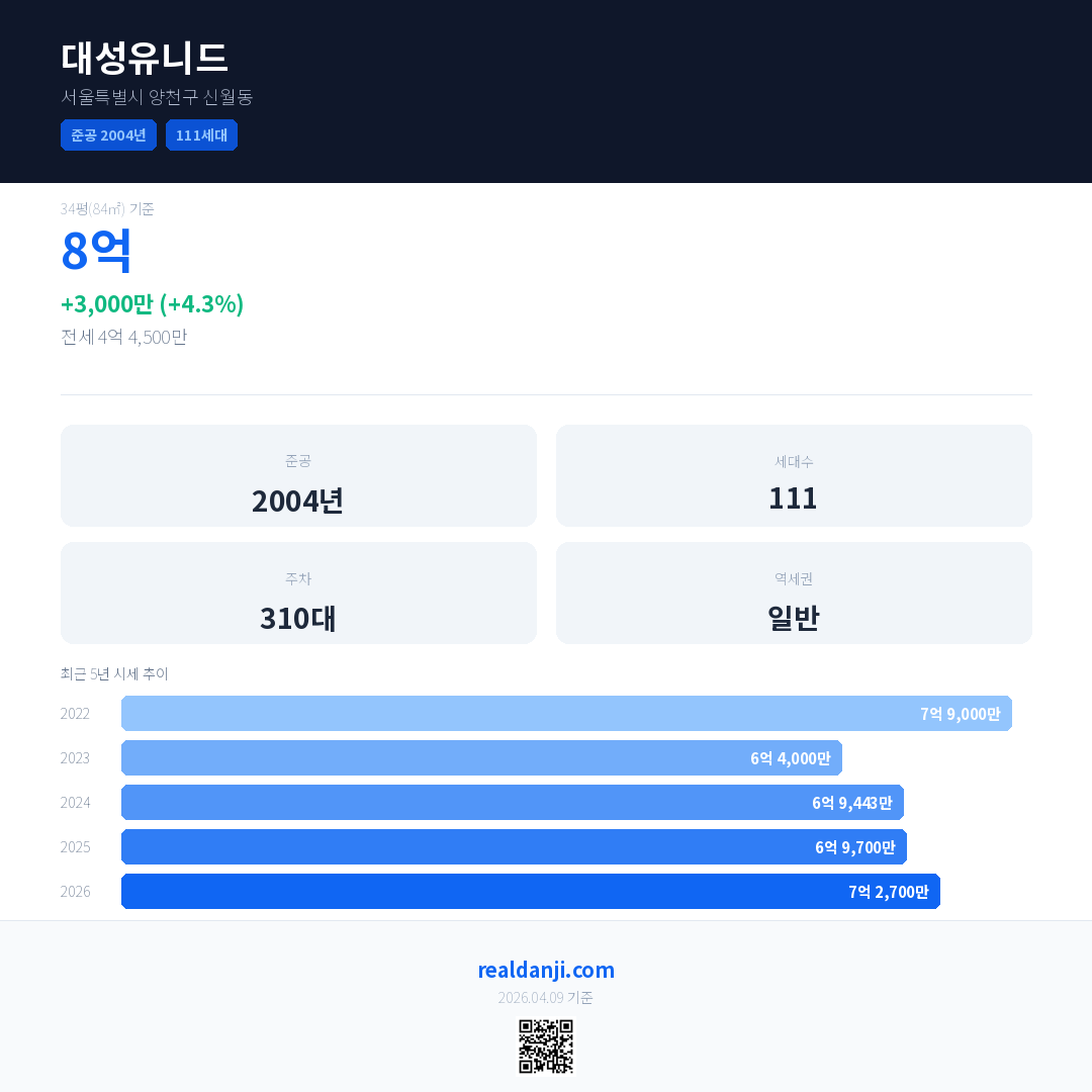 대성유니드 국민평형 기준 2026년 평균 거래가는 7억 2,700만으로, 전년 대비 4.3% 상승 했습니다.
