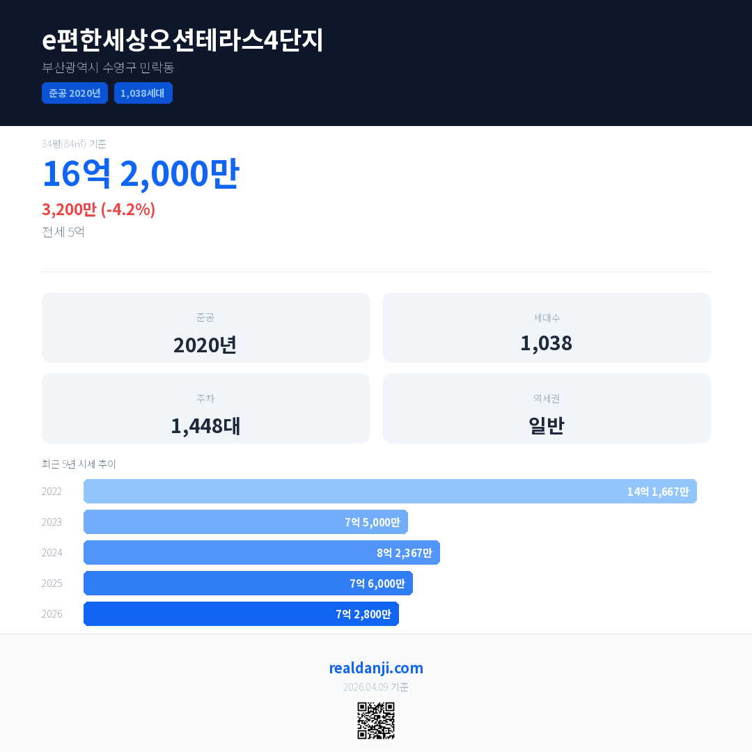 e편한세상오션테라스4단지 최근 거래가는 16억 2,000만입니다. (2026-03)
