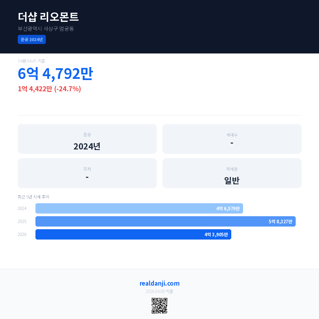 더샵 리오몬트 국민평형 기준 2026년 평균 거래가는 4억 3,905만으로, 전년 대비 24.7% 하락 했습니다.