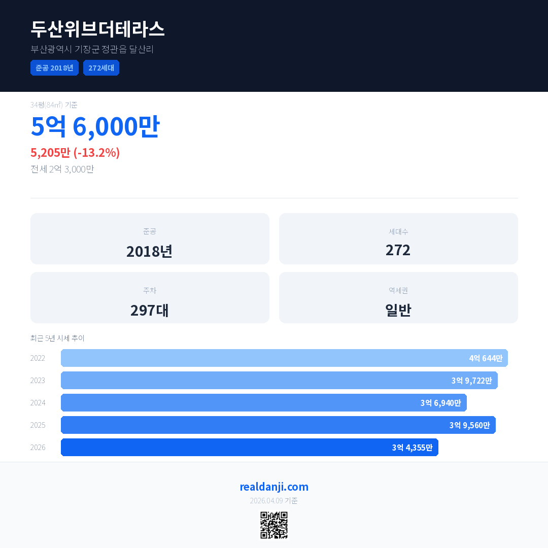 두산위브더테라스 국민평형 기준 2026년 평균 거래가는 3억 4,355만으로, 전년 대비 13.2% 하락 했습니다.