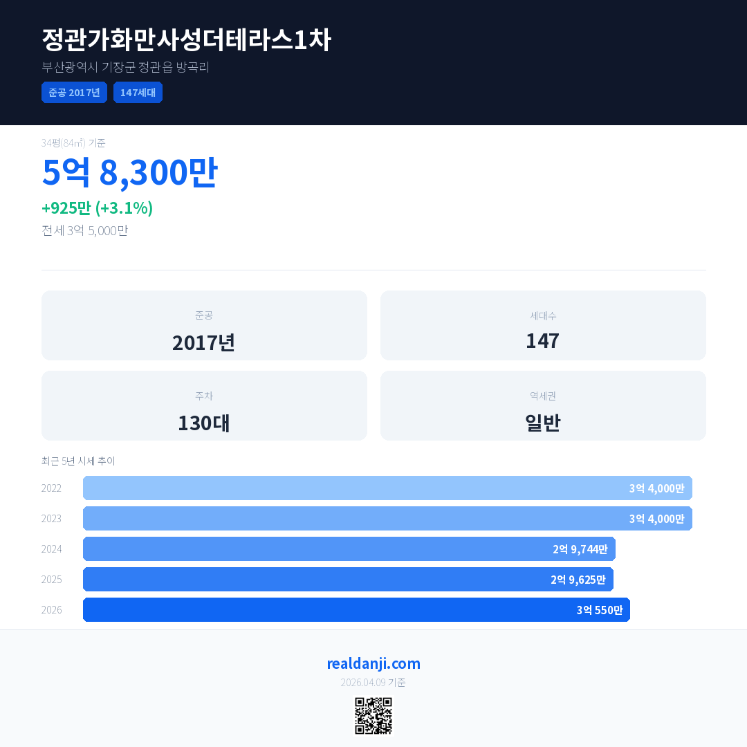 정관가화만사성더테라스1차 최근 거래가는 5억 8,300만입니다. (2026-03)