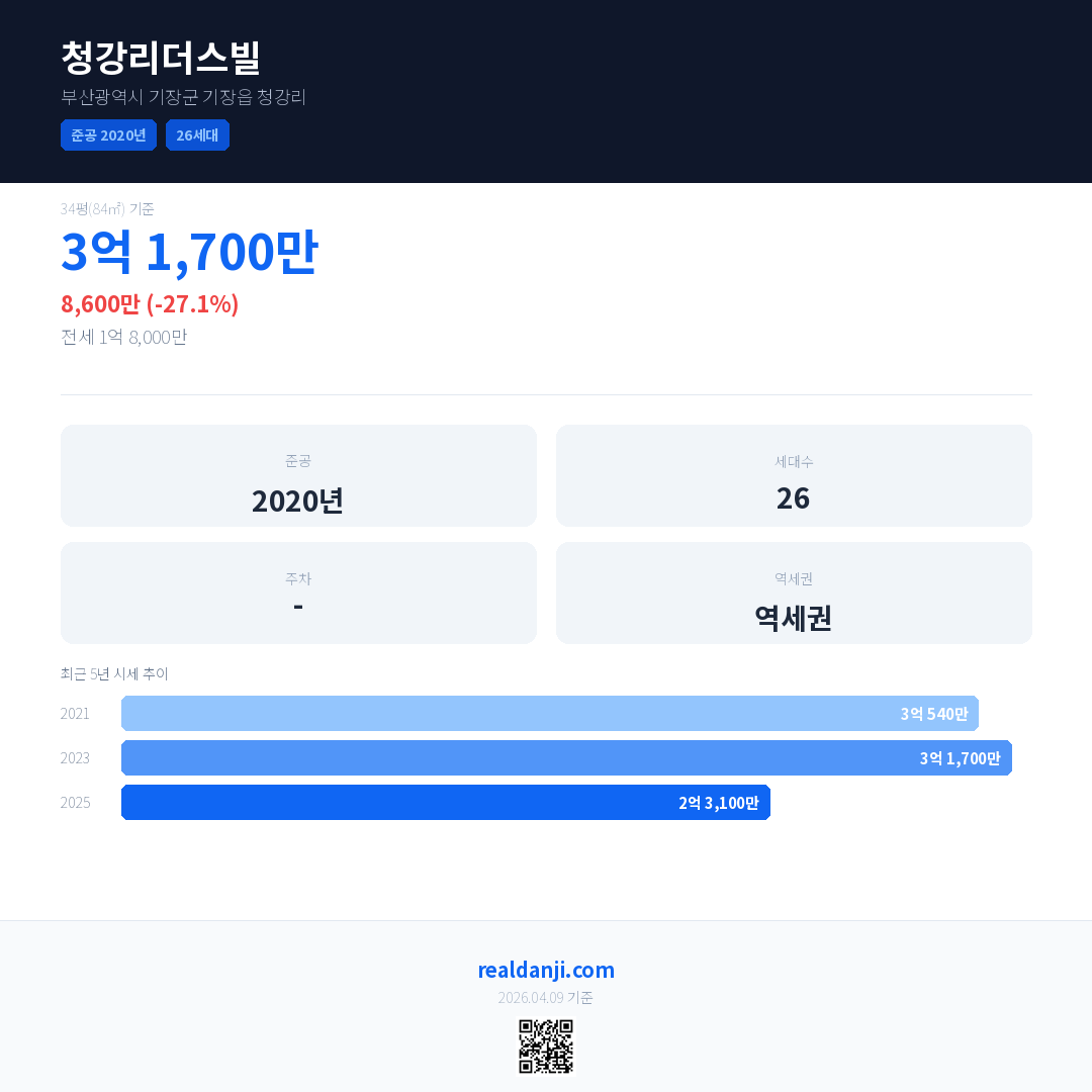 청강리더스빌 국민평형 기준 2025년 평균 거래가는 2억 3,100만으로, 전년 대비 27.1% 하락 했습니다.