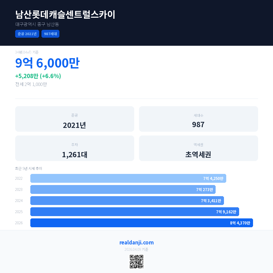 남산롯데캐슬센트럴스카이 국민평형 기준 2026년 평균 거래가는 8억 4,370만으로, 전년 대비 6.6% 상승 했습니다.