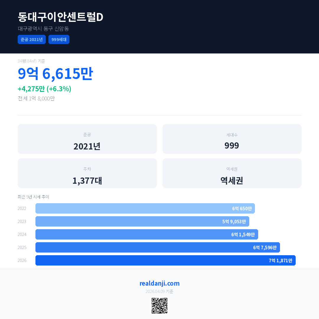 동대구이안센트럴D 국민평형 기준 2026년 평균 거래가는 7억 1,871만으로, 전년 대비 6.3% 상승 했습니다.