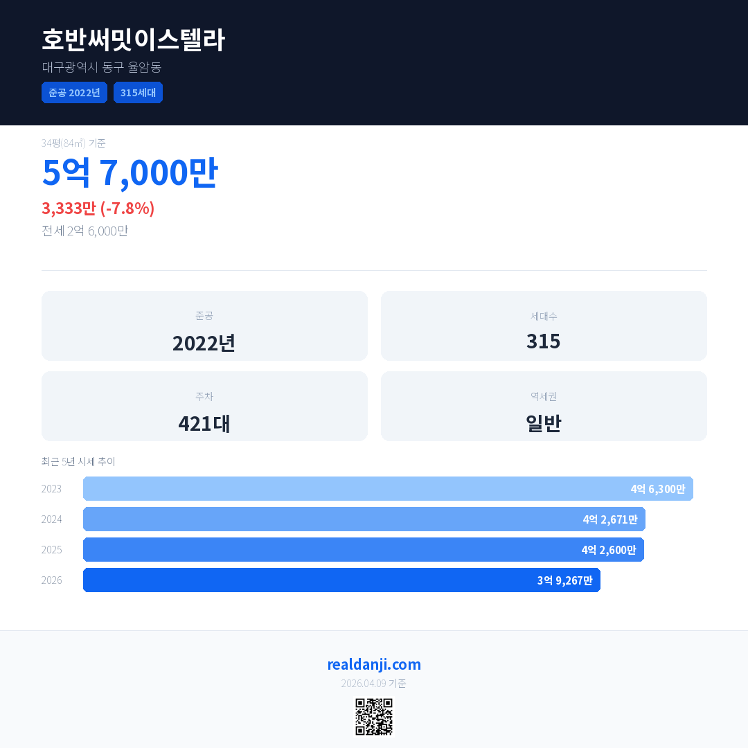 호반써밋이스텔라 국민평형 기준 2026년 평균 거래가는 3억 9,267만으로, 전년 대비 7.8% 하락 했습니다.