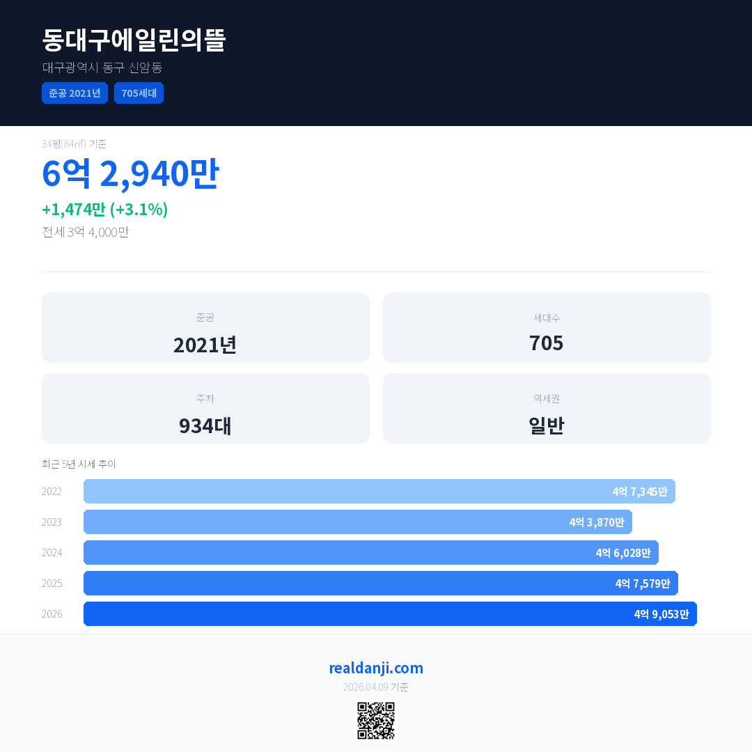 동대구에일린의뜰 국민평형 기준 2026년 평균 거래가는 4억 9,053만으로, 전년 대비 3.1% 상승 했습니다.