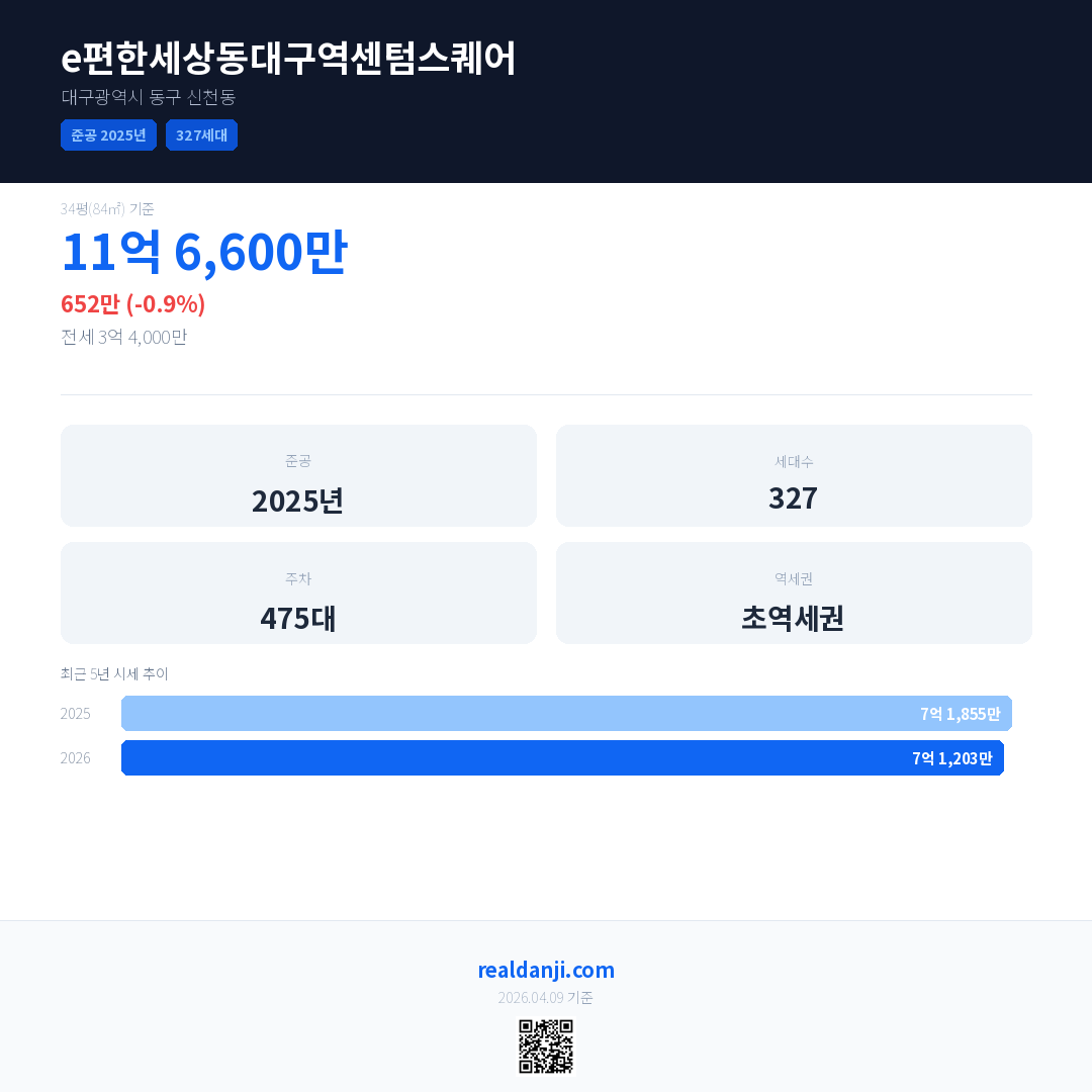e편한세상동대구역센텀스퀘어은(는) 2025년에 준공되었으며, 현재 1년차입니다. 총 327세대 규모입니다.