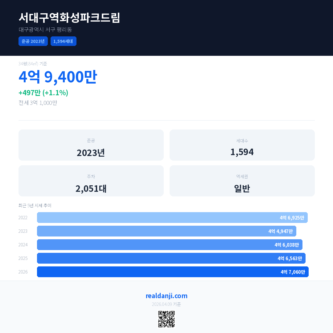 서대구역화성파크드림 최근 거래가는 4억 9,400만입니다. (2026-03)