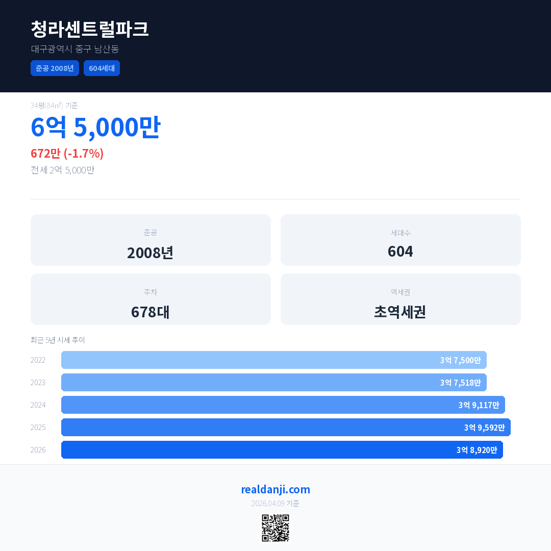 청라센트럴파크 최근 거래가는 6억 5,000만입니다. (2026-03)