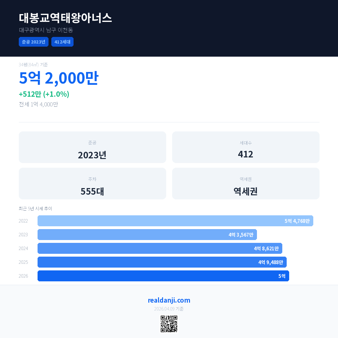 대봉교역태왕아너스 국민평형 기준 2026년 평균 거래가는 5억으로, 전년 대비 1.0% 상승 했습니다.