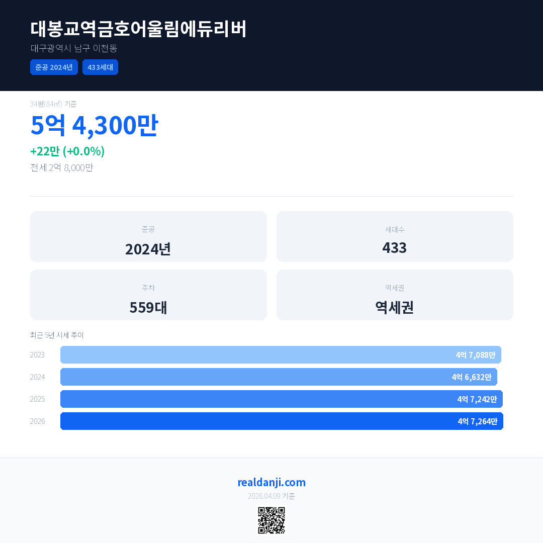 대봉교역금호어울림에듀리버 국민평형 기준 2026년 평균 거래가는 4억 7,264만으로, 전년 대비 0.0% 하락 했습니다.