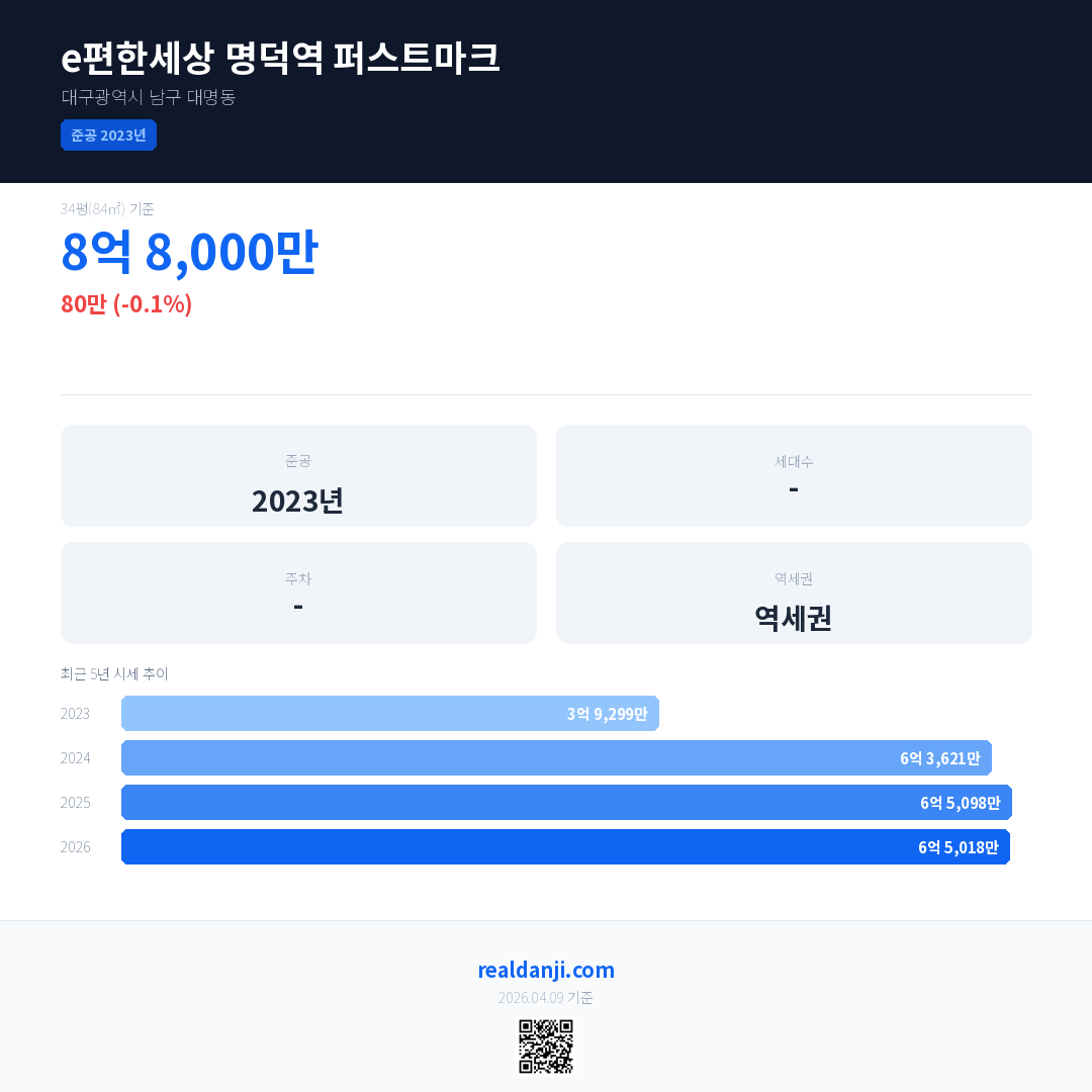 e편한세상 명덕역 퍼스트마크 국민평형 기준 2026년 평균 거래가는 6억 5,018만으로, 전년 대비 0.1% 하락 했습니다.