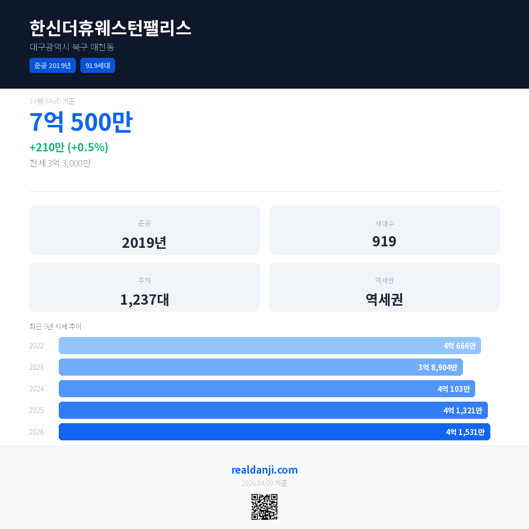 한신더휴웨스턴팰리스 국민평형 기준 2026년 평균 거래가는 4억 1,531만으로, 전년 대비 0.5% 상승 했습니다.