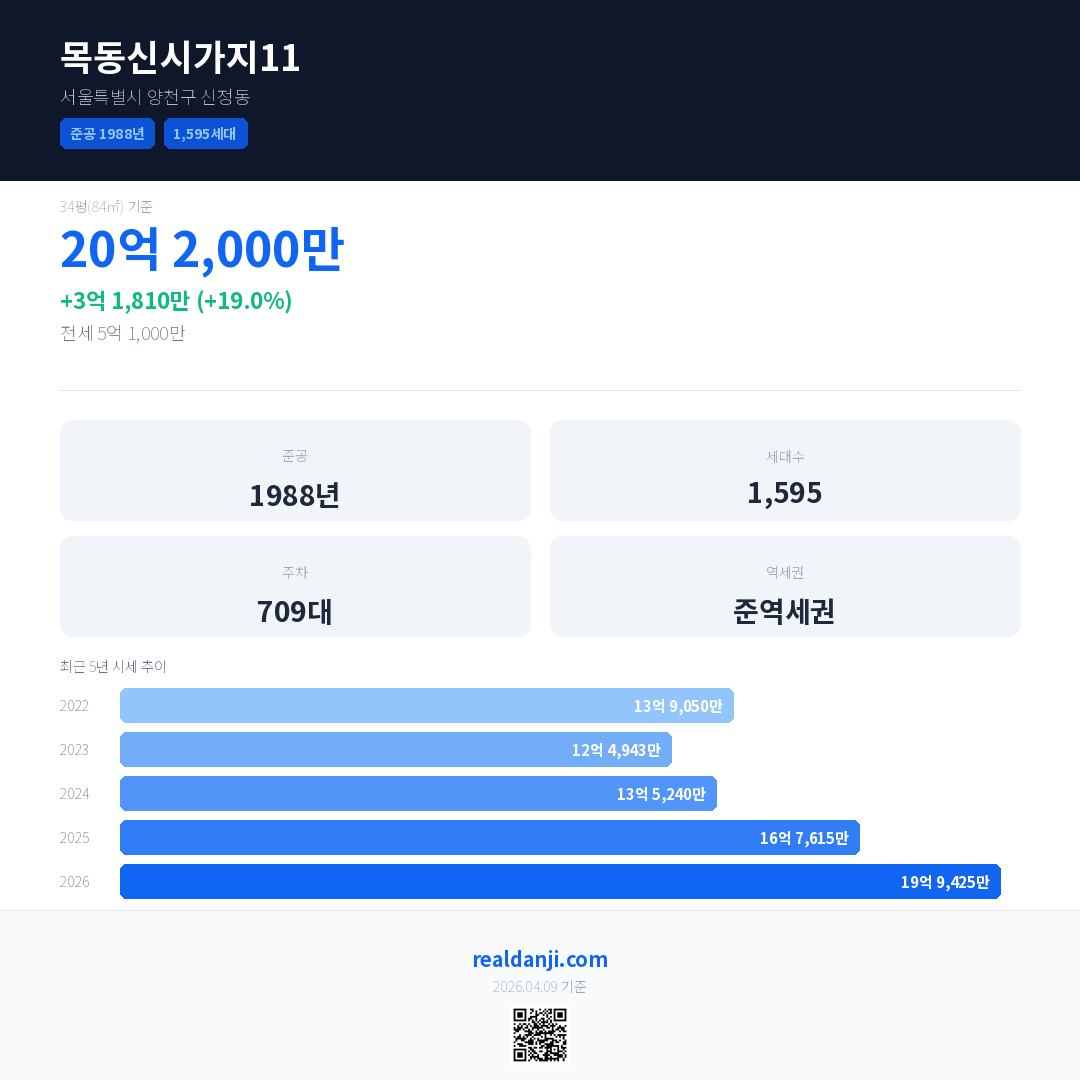 목동신시가지11 최근 거래가는 20억 2,000만입니다. (2026-02)