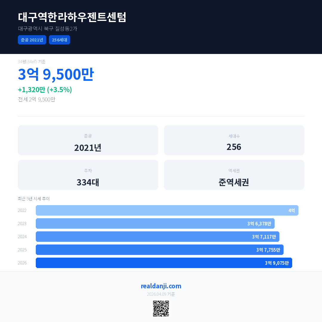 대구역한라하우젠트센텀 국민평형 기준 2026년 평균 거래가는 3억 9,075만으로, 전년 대비 3.5% 상승 했습니다.