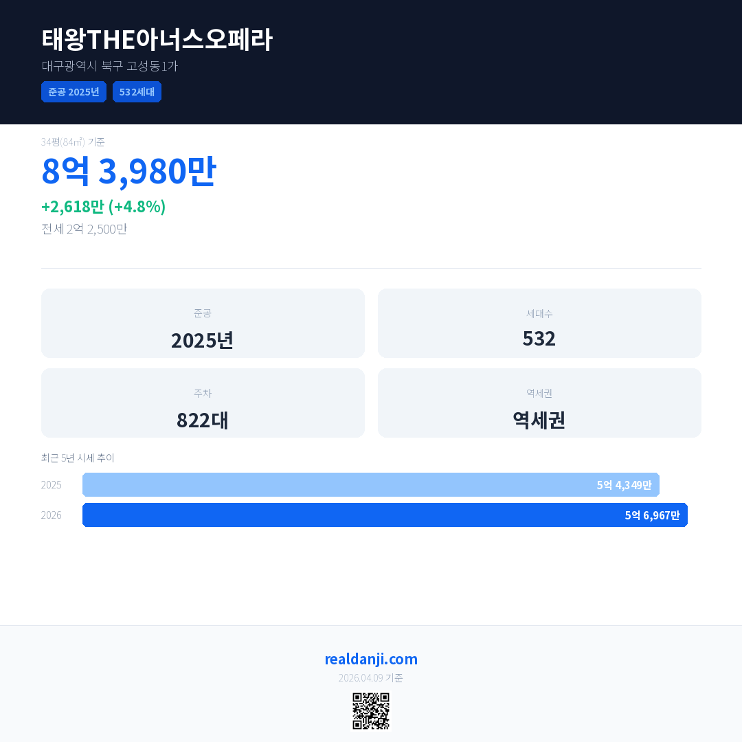 태왕THE아너스오페라 최근 거래가는 8억 3,980만입니다. (2026-02)