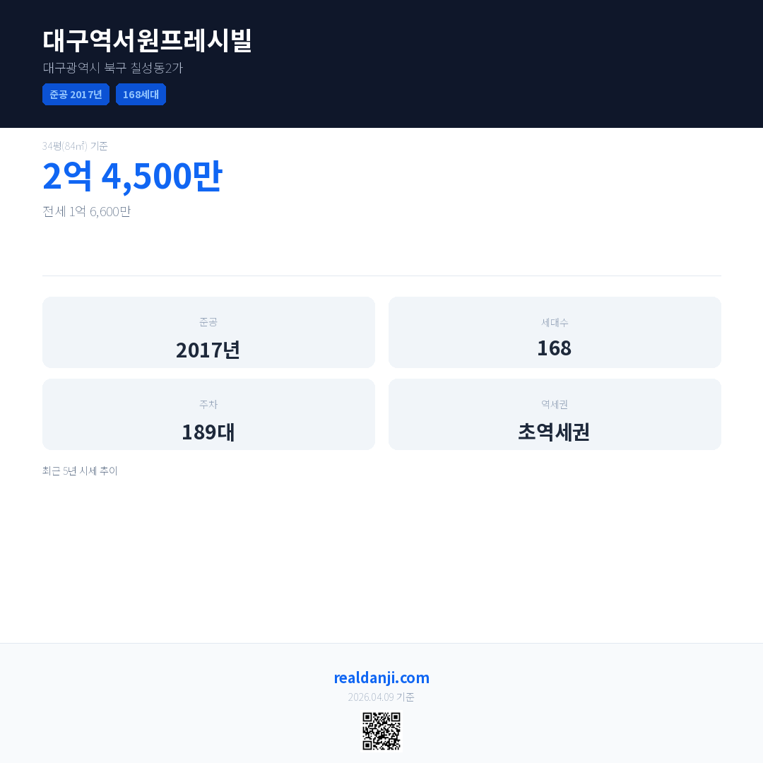 대구역서원프레시빌은(는) 2017년에 준공되었으며, 현재 9년차입니다. 총 168세대 규모입니다.