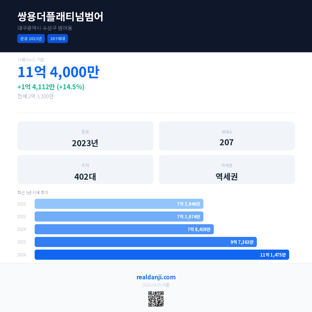 쌍용더플래티넘범어 국민평형 기준 2026년 평균 거래가는 11억 1,475만으로, 전년 대비 14.5% 상승 했습니다.