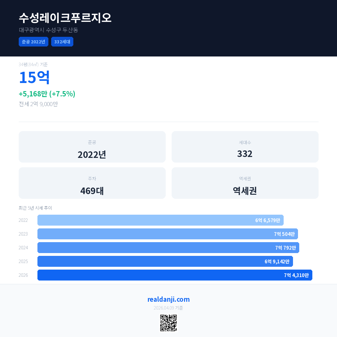 수성레이크푸르지오 최근 거래가는 15억입니다. (2026-03)