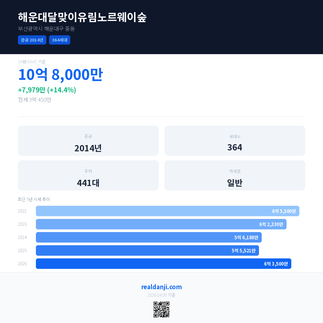 해운대달맞이유림노르웨이숲 국민평형 기준 2026년 평균 거래가는 6억 3,500만으로, 전년 대비 14.4% 상승 했습니다.