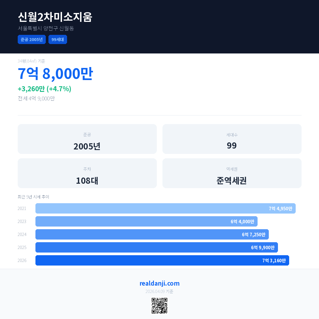 신월2차미소지움은(는) 2005년에 준공되었으며, 현재 21년차입니다. 총 99세대 규모입니다.