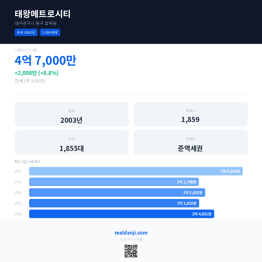 태왕메트로시티 국민평형 기준 2026년 평균 거래가는 2억 4,831만으로, 전년 대비 8.8% 상승 했습니다.