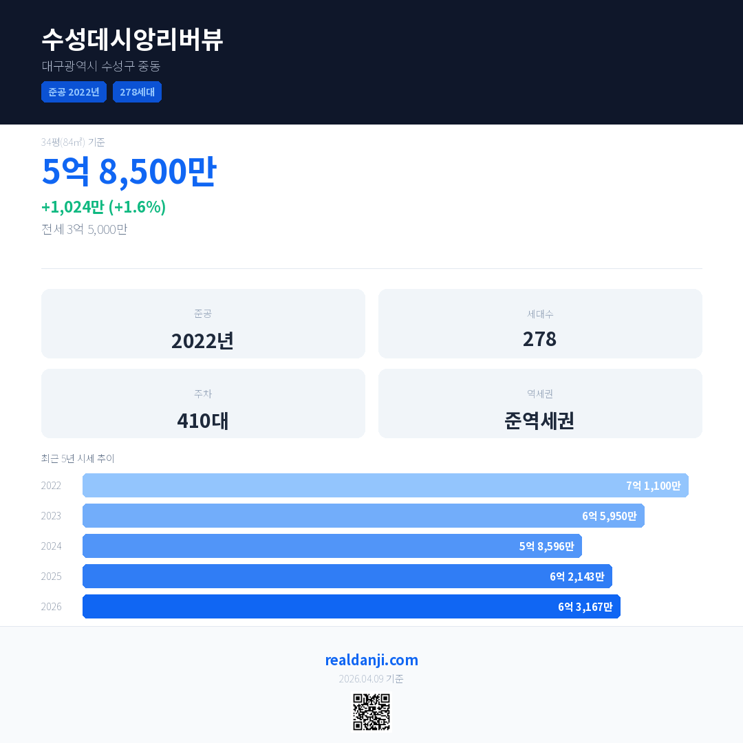 수성데시앙리버뷰 국민평형 기준 2026년 평균 거래가는 6억 3,167만으로, 전년 대비 1.6% 상승 했습니다.