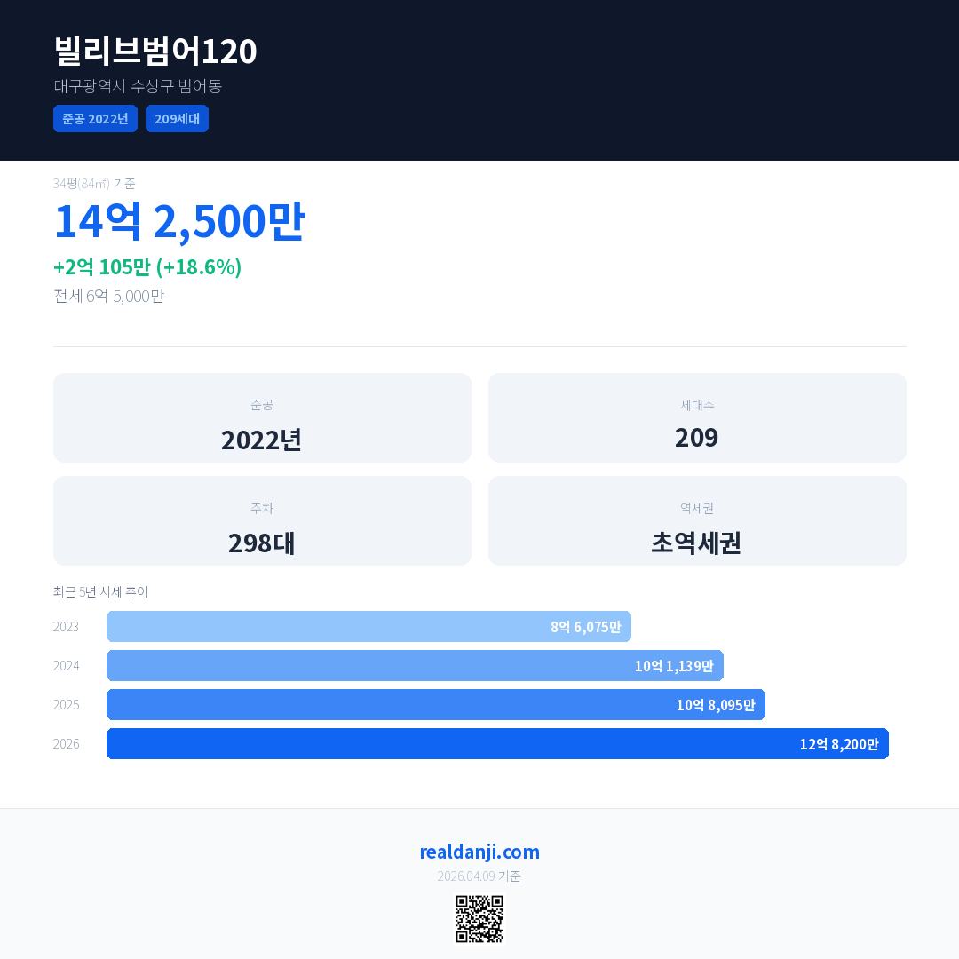 빌리브범어120 국민평형 기준 2026년 평균 거래가는 12억 8,200만으로, 전년 대비 18.6% 상승 했습니다.