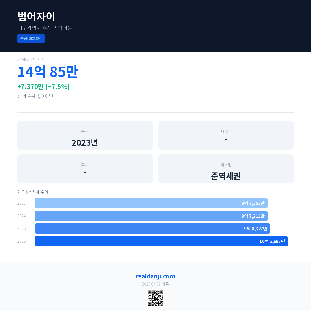 범어자이 국민평형 기준 2026년 평균 거래가는 10억 5,697만으로, 전년 대비 7.5% 상승 했습니다.