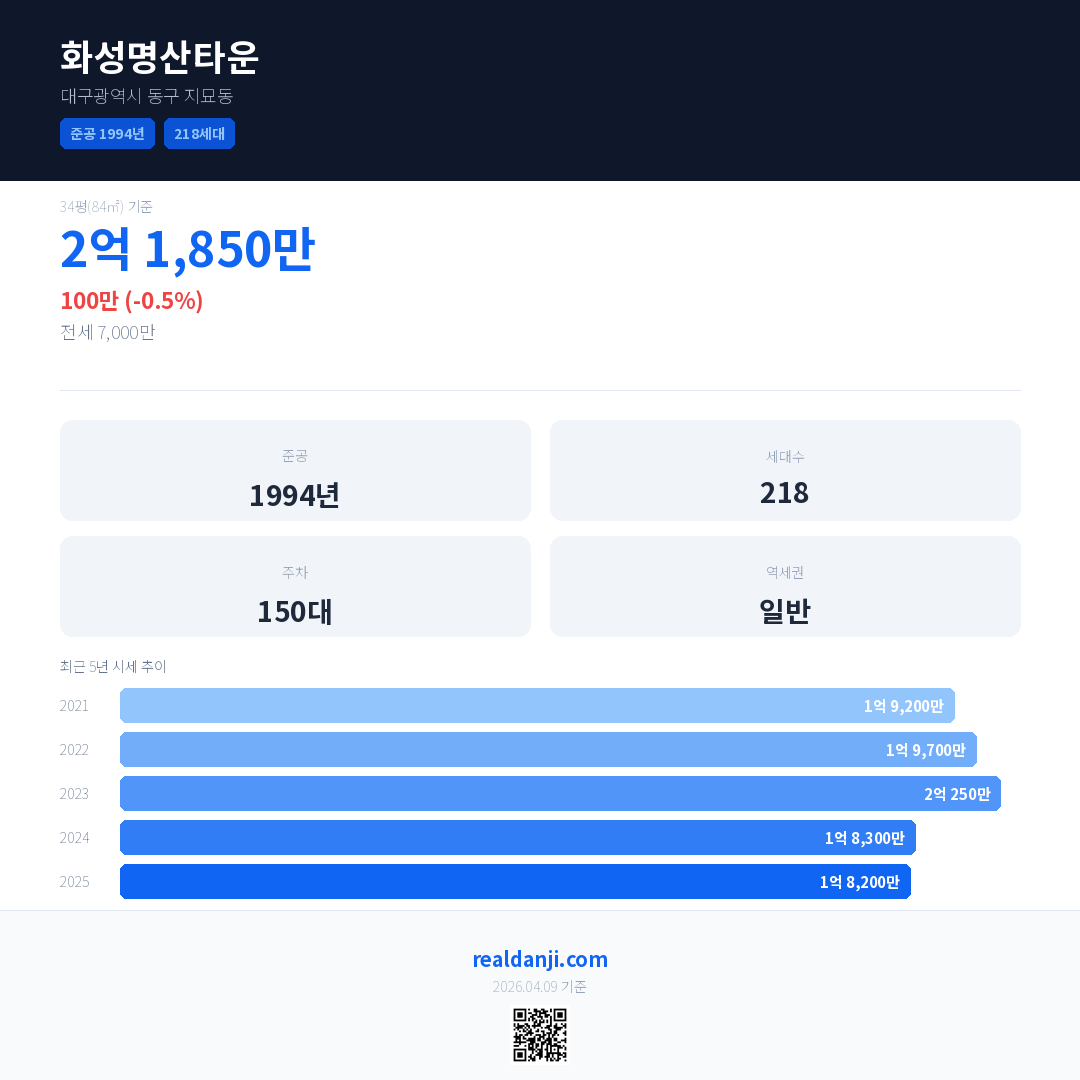 화성명산타운 국민평형 기준 2025년 평균 거래가는 1억 8,200만으로, 전년 대비 0.5% 하락 했습니다.