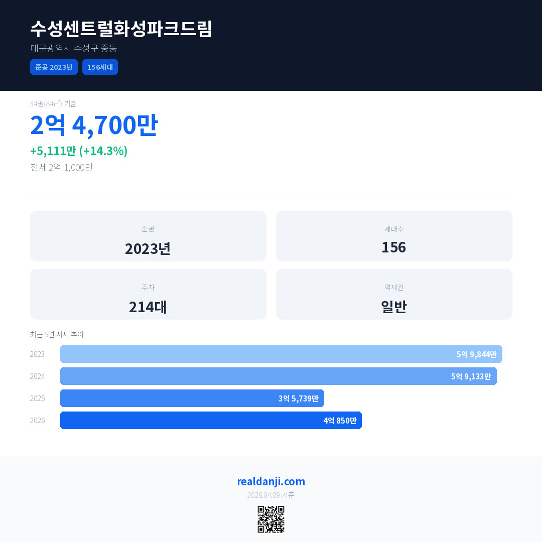 수성센트럴화성파크드림 국민평형 기준 2026년 평균 거래가는 4억 850만으로, 전년 대비 14.3% 상승 했습니다.
