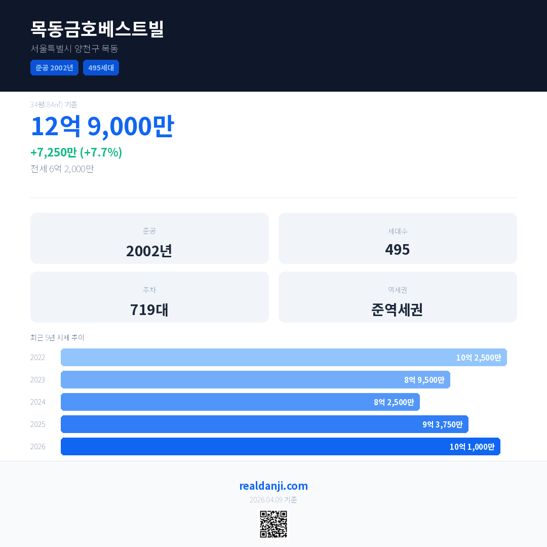 목동금호베스트빌 국민평형 기준 2026년 평균 거래가는 10억 1,000만으로, 전년 대비 7.7% 상승 했습니다.