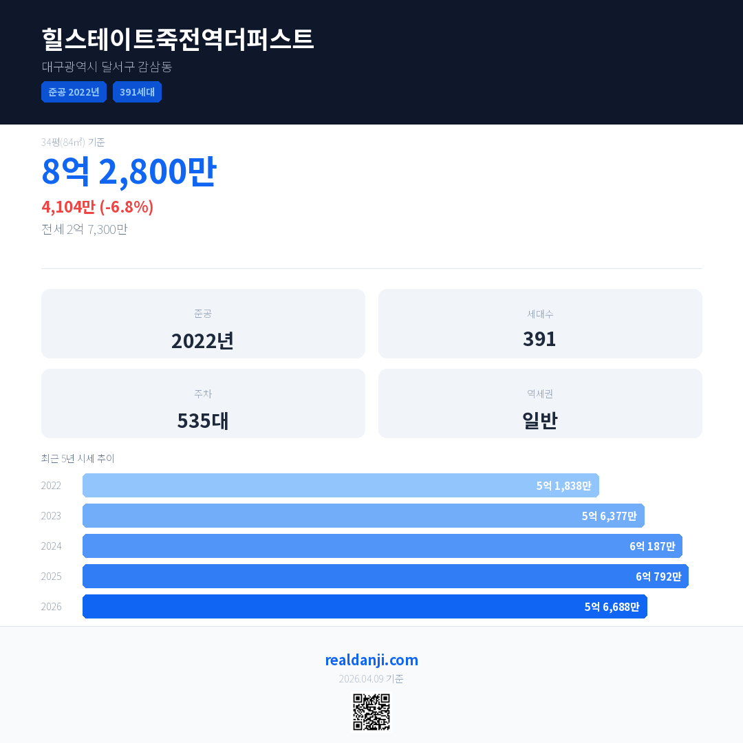 힐스테이트죽전역더퍼스트 국민평형 기준 2026년 평균 거래가는 5억 6,688만으로, 전년 대비 6.8% 하락 했습니다.