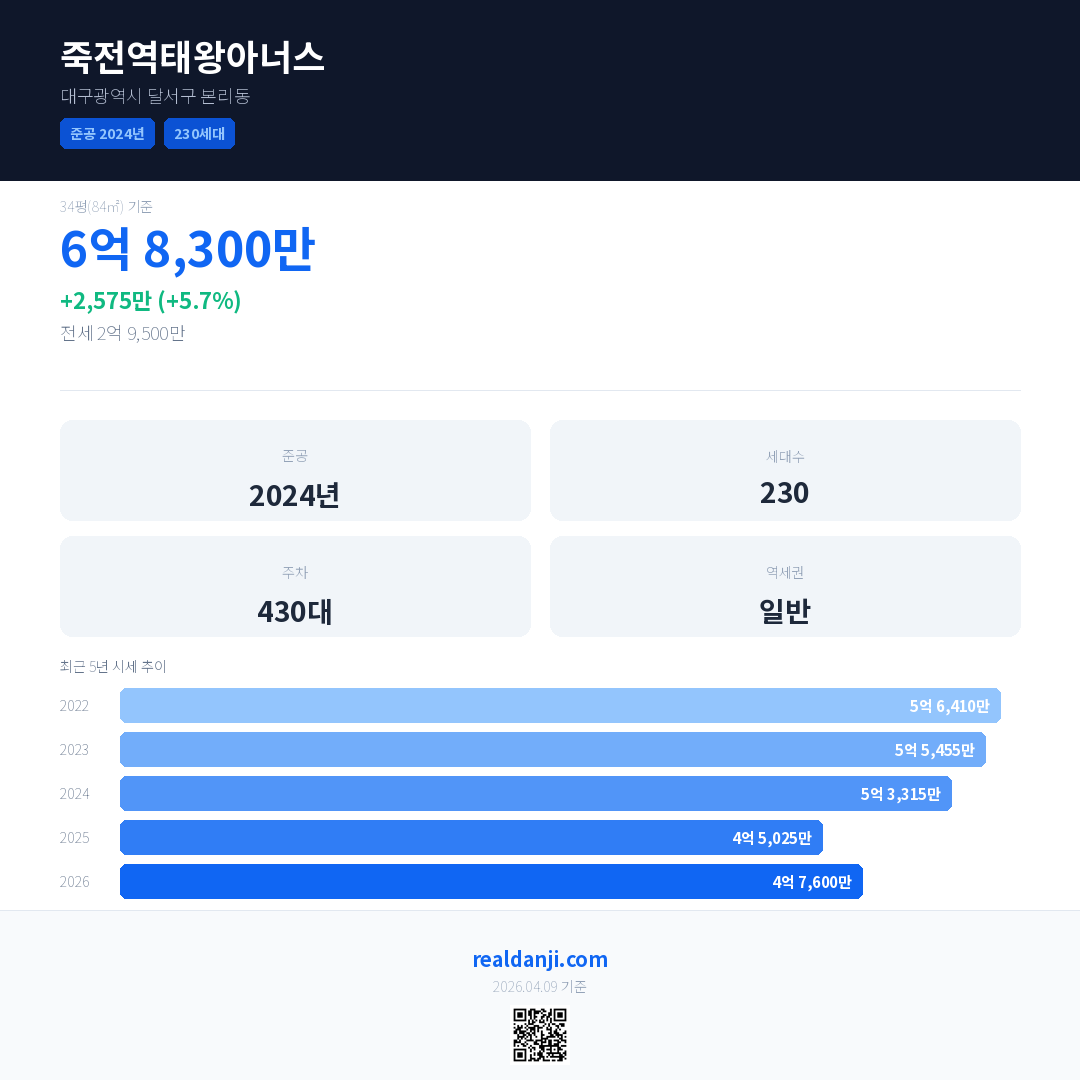 죽전역태왕아너스 국민평형 기준 2026년 평균 거래가는 4억 7,600만으로, 전년 대비 5.7% 상승 했습니다.