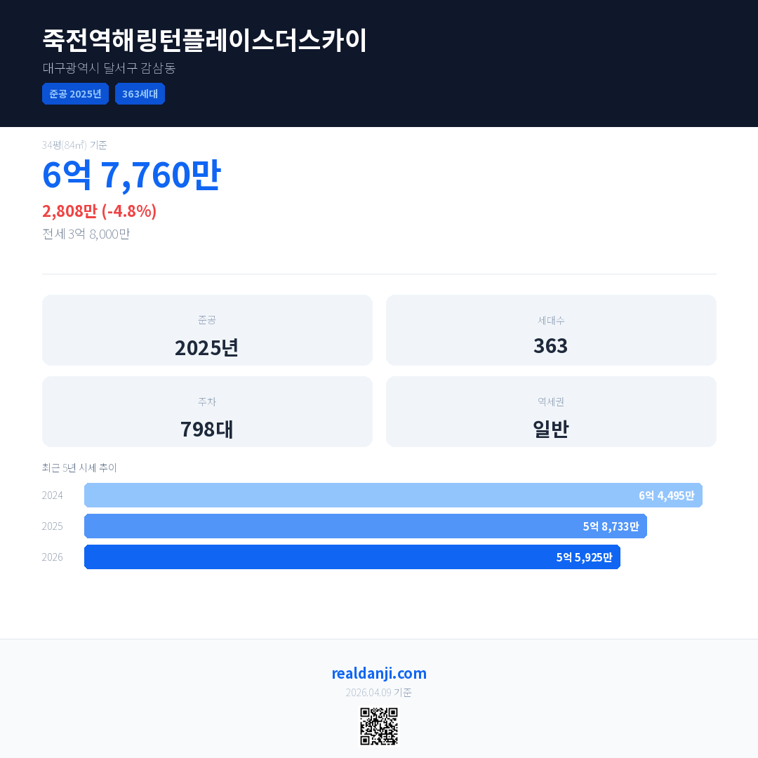 죽전역해링턴플레이스더스카이 국민평형 기준 2026년 평균 거래가는 5억 5,925만으로, 전년 대비 4.8% 하락 했습니다.