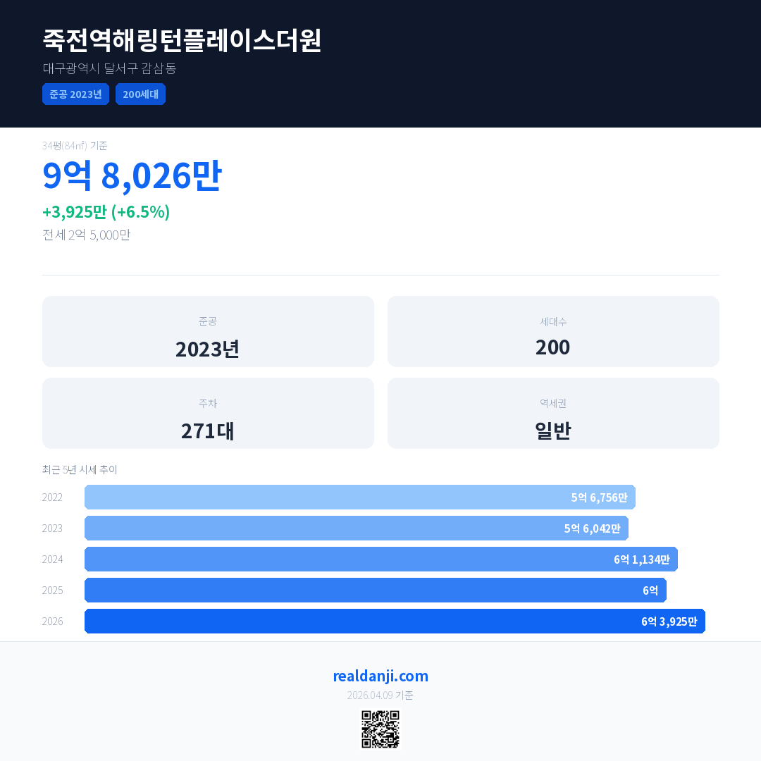죽전역해링턴플레이스더원 국민평형 기준 2026년 평균 거래가는 6억 3,925만으로, 전년 대비 6.5% 상승 했습니다.