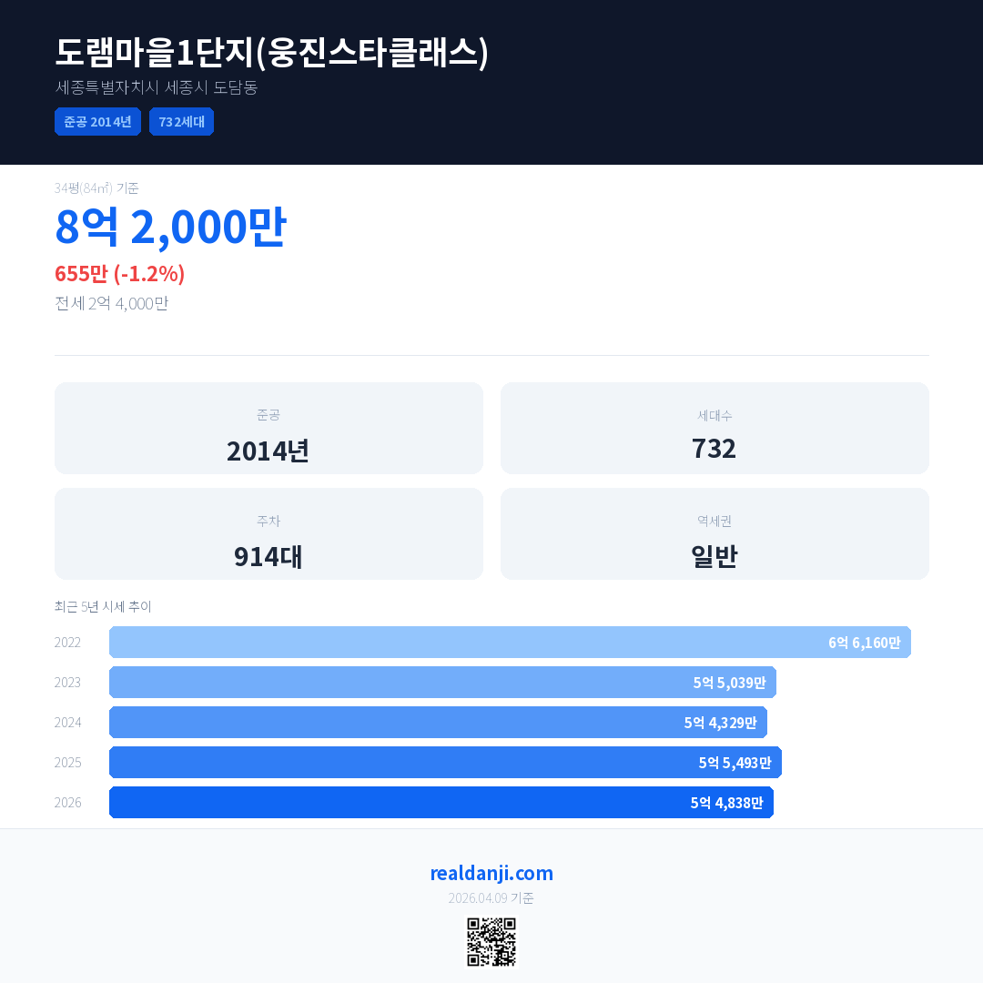 도램마을1단지(웅진스타클래스) 국민평형 기준 2026년 평균 거래가는 5억 4,838만으로, 전년 대비 1.2% 하락 했습니다.