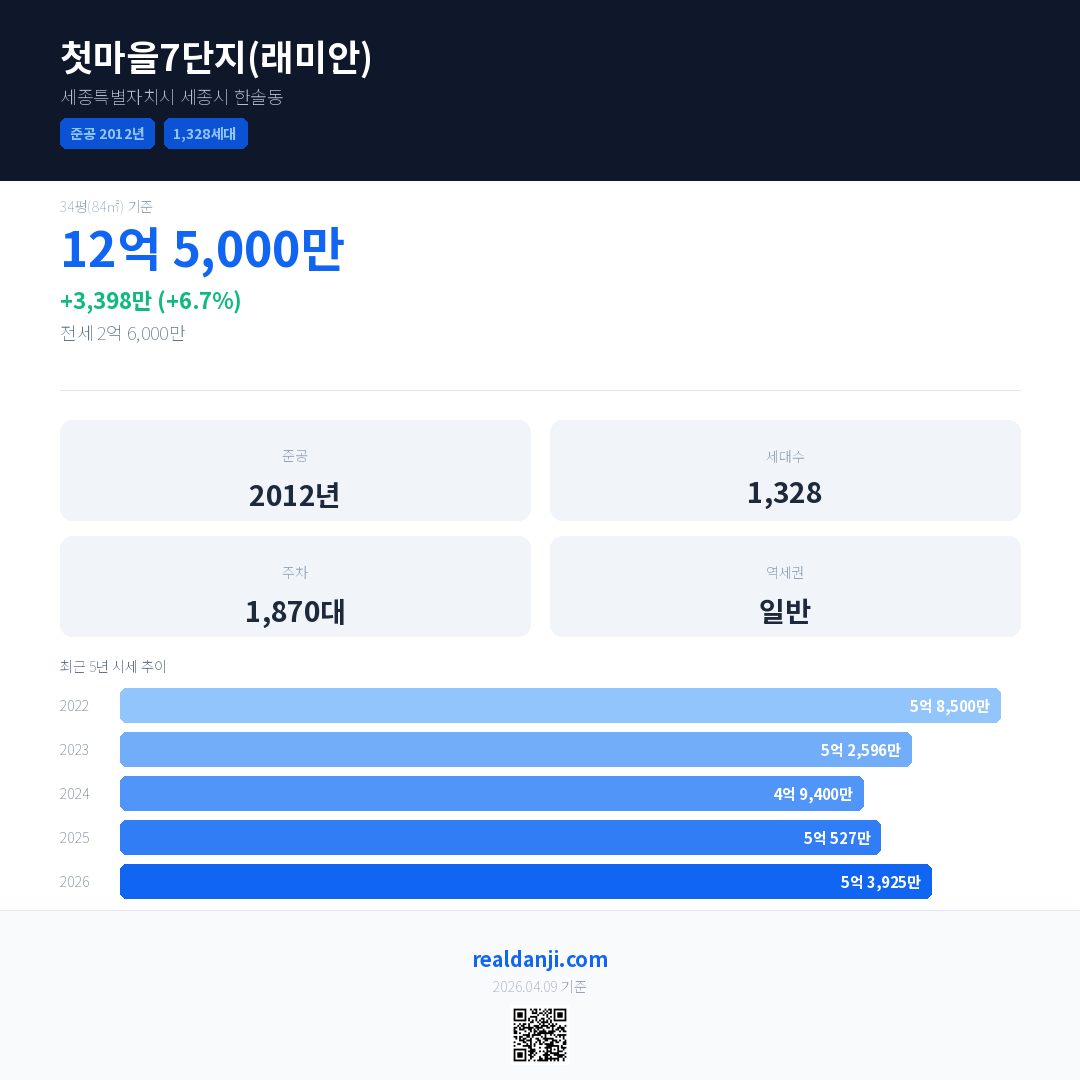 첫마을7단지(래미안) 국민평형 기준 2026년 평균 거래가는 5억 3,925만으로, 전년 대비 6.7% 상승 했습니다.