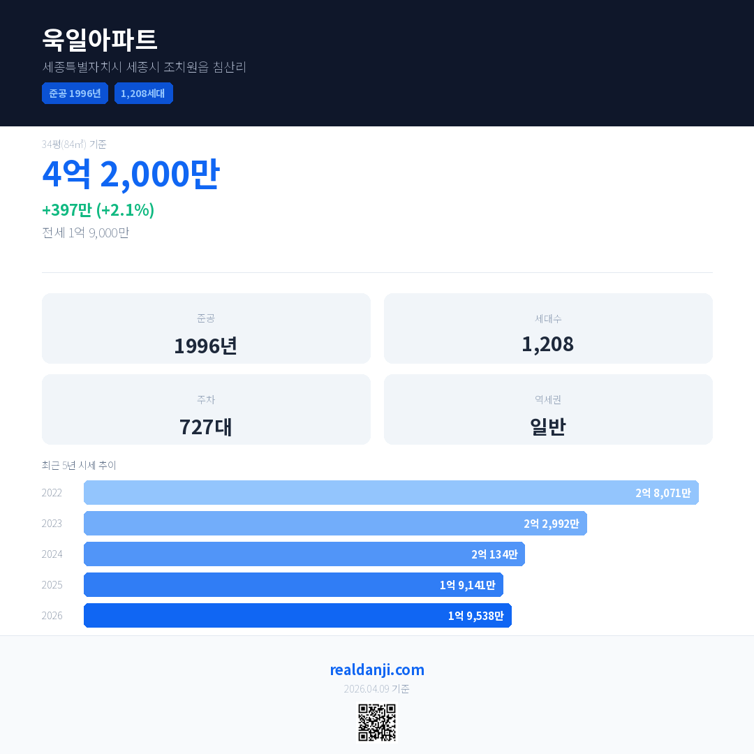 욱일아파트 국민평형 기준 2026년 평균 거래가는 1억 9,538만으로, 전년 대비 2.1% 상승 했습니다.
